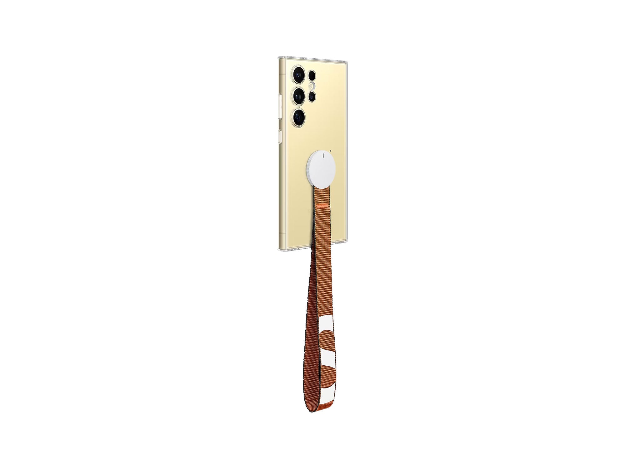 Five different accessories compatible with the Clear Gadget Case are shown. On the left, the rear shot of the Samsung Galaxy S24 Ultra in the Card Case with Strap with an orange Strap. Next, three grip accessories, Grip SKZOO, Grip Smiley, Grip Minions, are laid out parallel to each other, showing the detachable grip feature. Below is the Camera Grip Stand that when attached, the device is securely held to allow hands-free viewing.