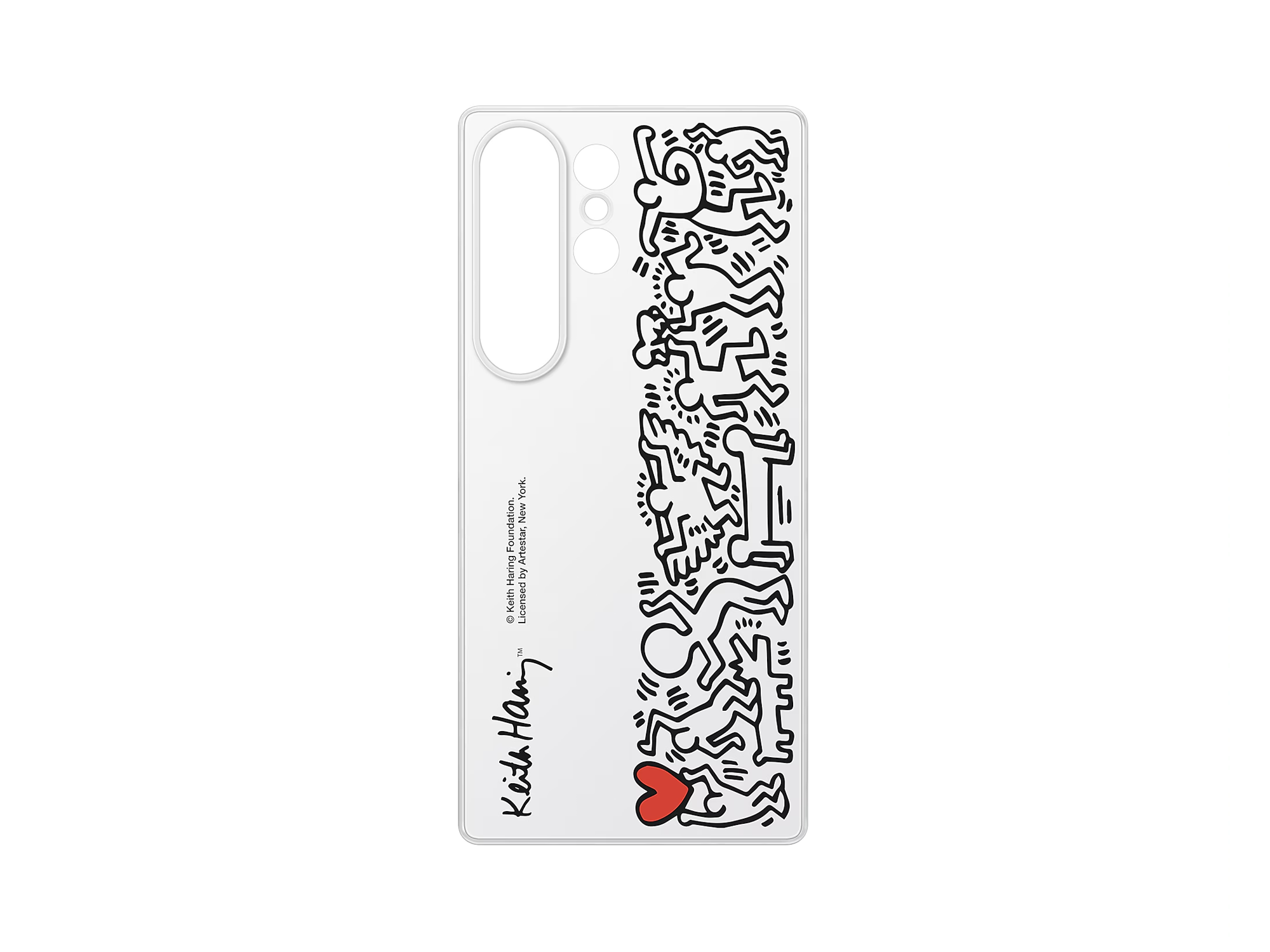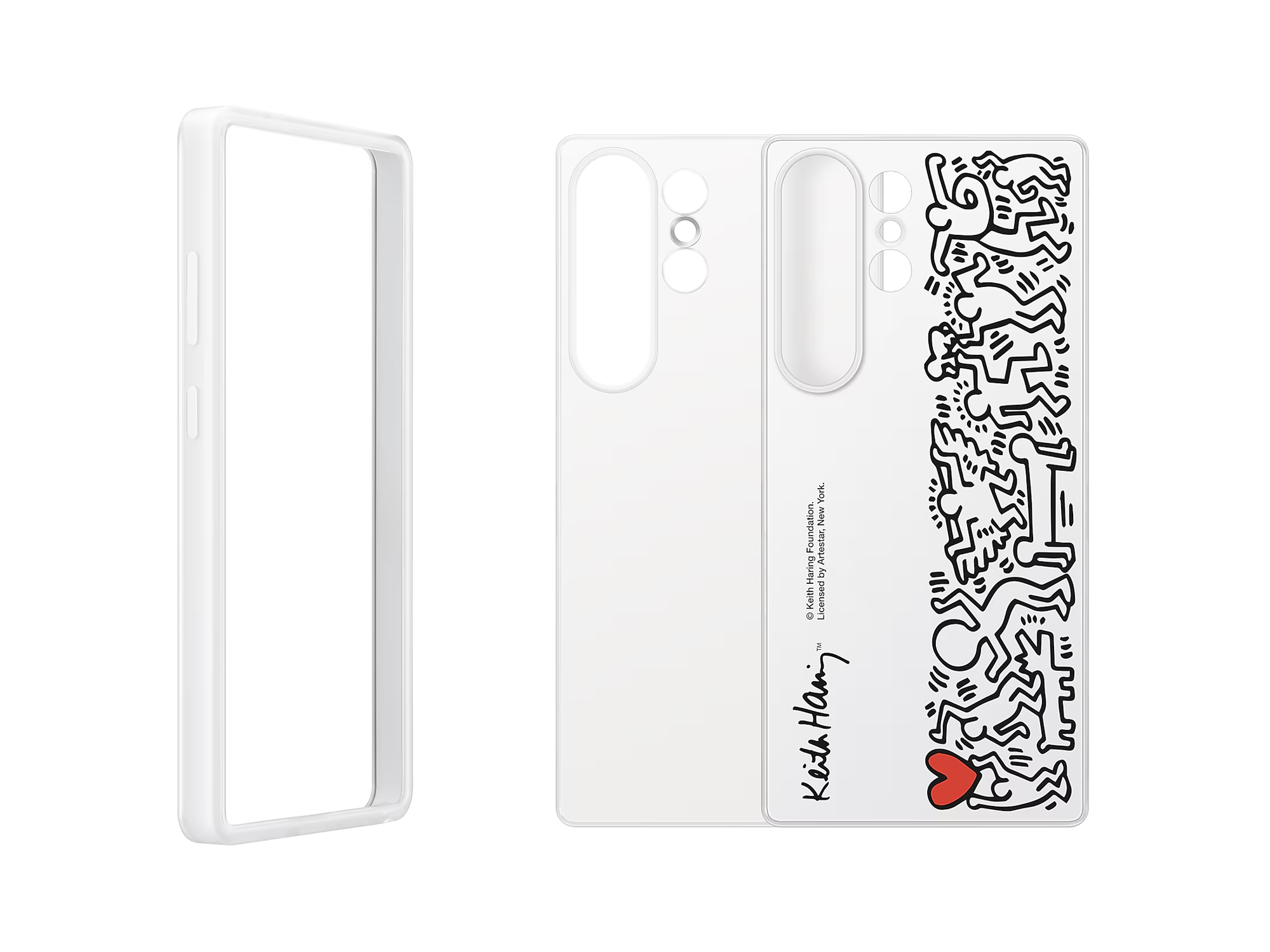 Two hands each hold a Galaxy S25 Ultra, both installed with the Flipsuit Case. One shows the smartphone from the screen side and the other shows it from the back, where the case's Keith Haring graphic is shown. On the upper right corner is a UL Environmental Claim Validation Mark that reads 'EF-MS938 CONTAINS A MINIMUM OF 2% BIO-BASED CONTENT, CONSISTING OF 8% BIO-BASED CONTENT IN THE FRAME OF EF-MS938, TESTED ACCORDING TO ASTM D6866-22. UL.COM/ECV'.