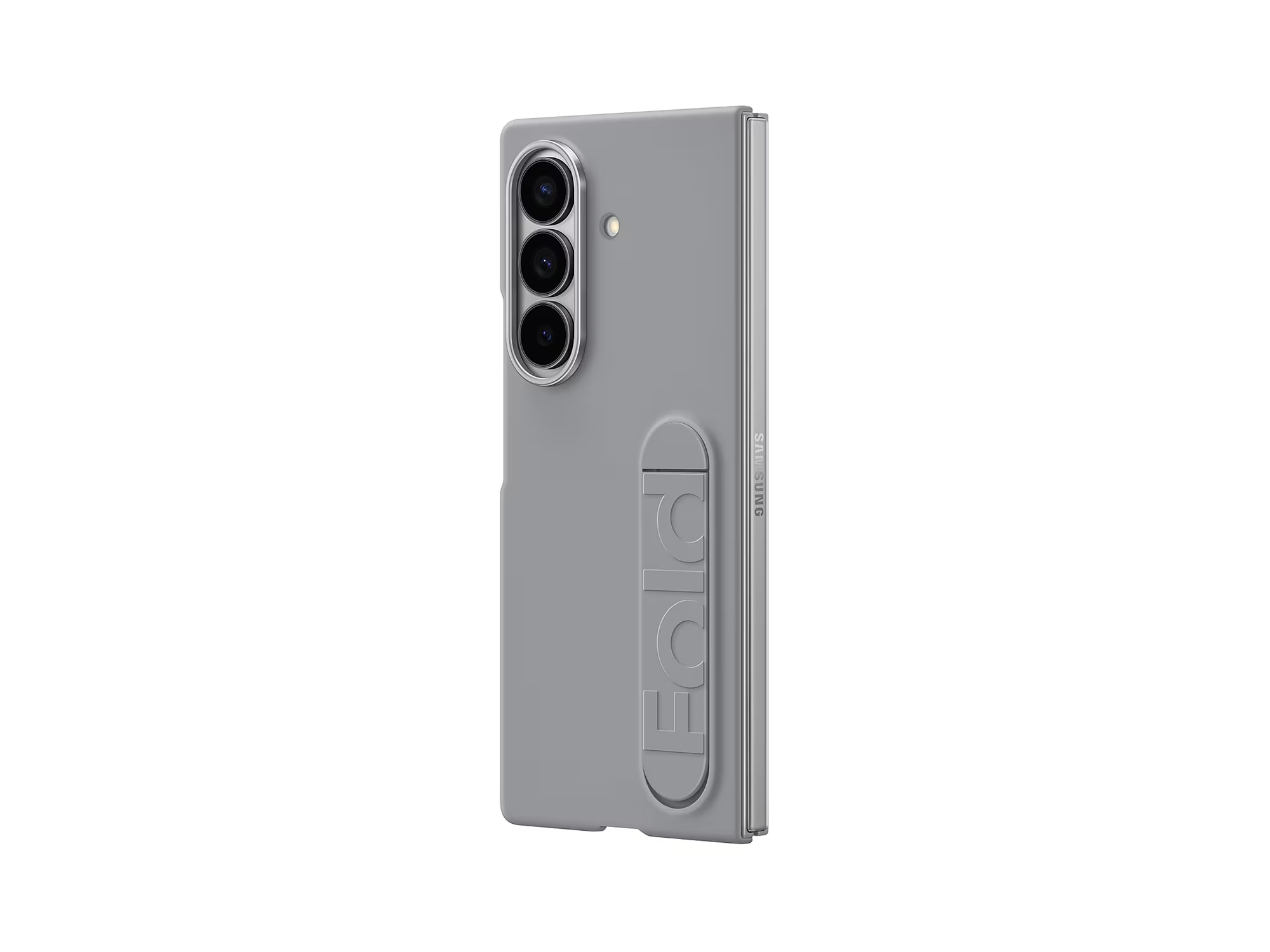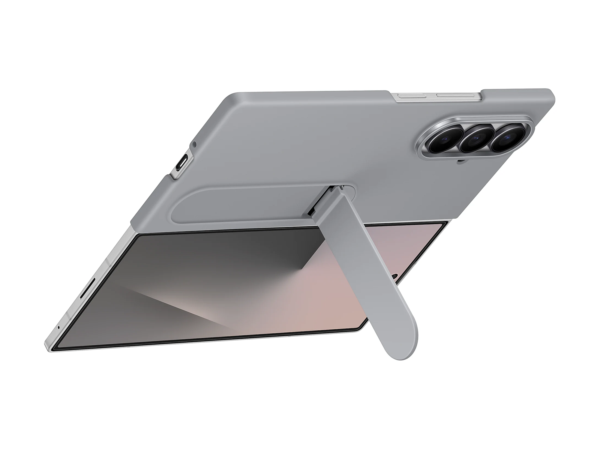 A Galaxy Z Fold7 is unfolded in landscape mode with the Silicone Case in Gray on. The case's stand supports the device, which is propped up and at a slight angle.